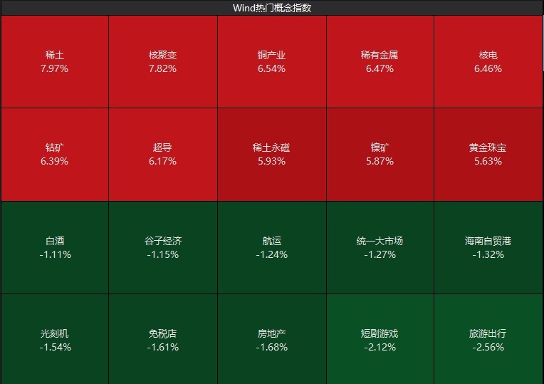 Wind数据显示天金策略,板块题材方面,稀土板块领涨,涨幅接近8%,核聚变板块涨7.82%,铜产业、稀有金属、核电、钴矿、超导等板块涨超6%。旅游出行、短剧游戏、房地产、免税店、光刻机等板块跌幅居前。