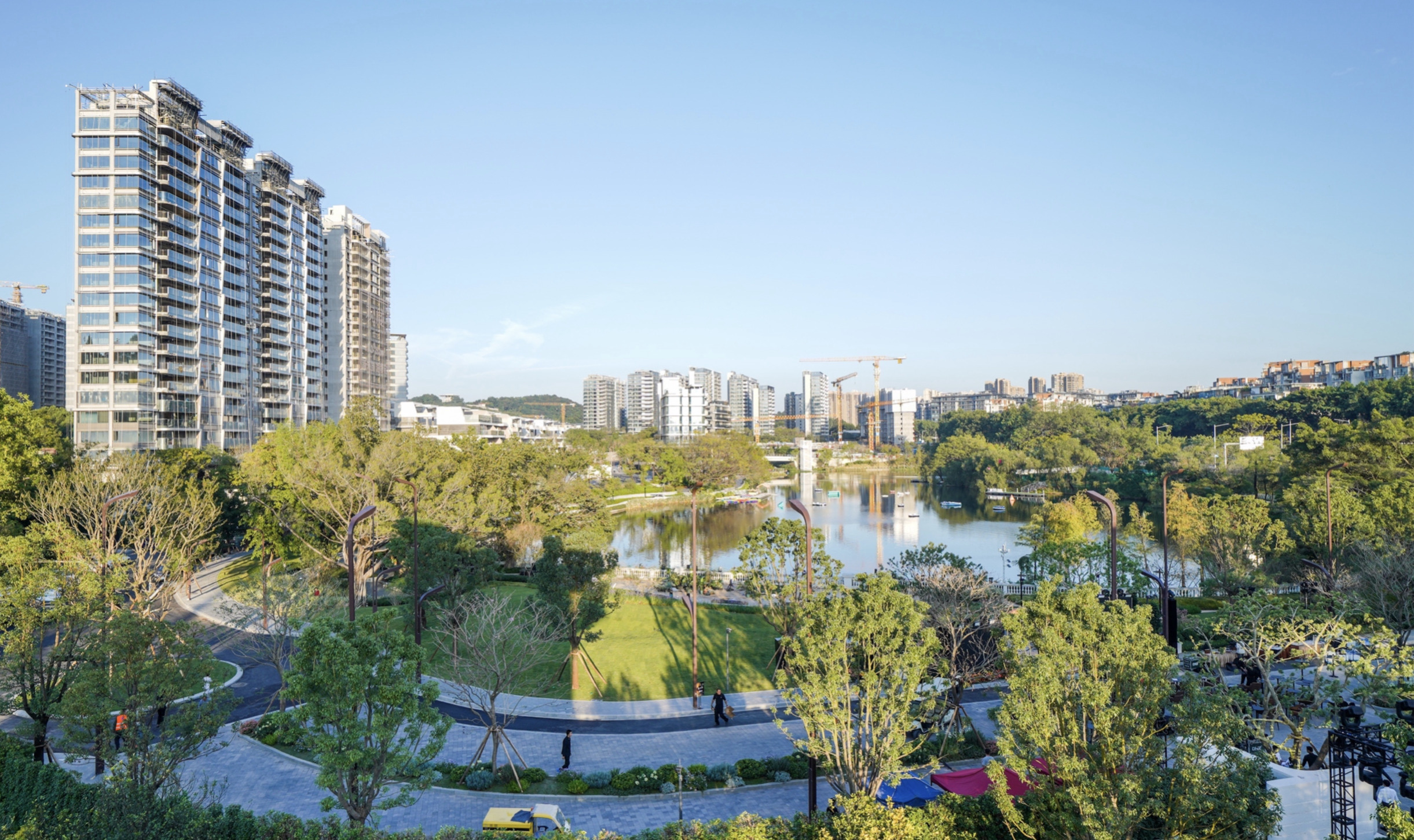 璞樾·墅所在的世界大观板块,自2023年8月起,越秀地产连续竞得世界大观一至三期地块,累计投入约143亿元,形成“两湖一谷”生态格局(太阳湖、月亮湖及绿谷公园),实现一线环湖的围合式连片开发。