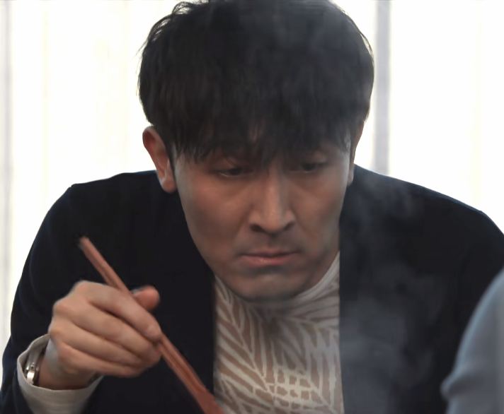 陈胜龙和一群手下聚餐商量对策,一出场面色如土、神色萎靡、拱肩驼背,一副没精气神的样子。
