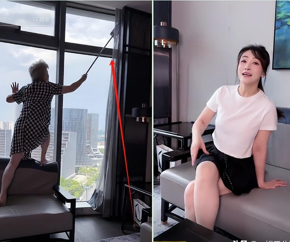 而白发苍苍的婆婆站在沙发上,举着拖把,在擦高处的玻璃。