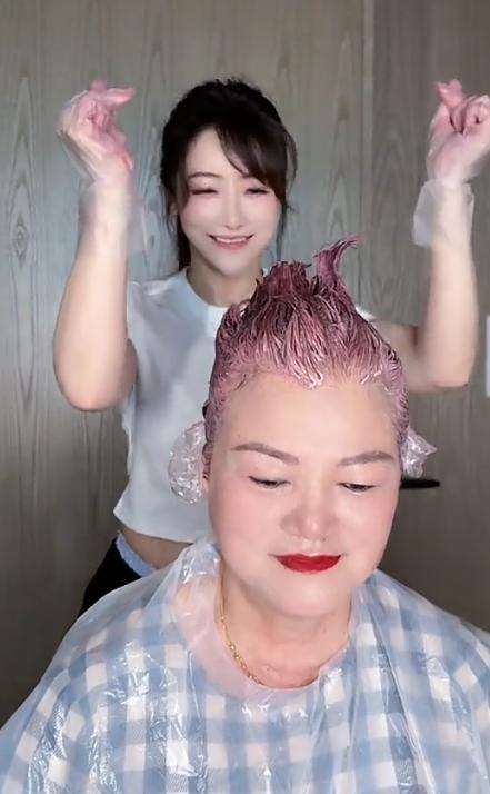 虽然在陈紫函撒娇的情况下,婆婆还是乖乖的围上了染发布。