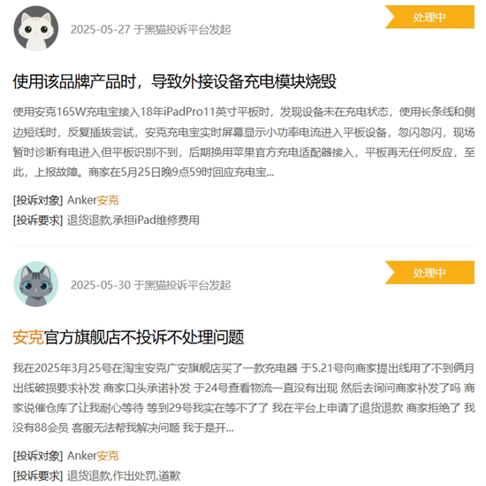 在社媒平台和“黑猫投诉 【下载黑猫投诉客户端】”平台上,也有不少消费者对安克移动电源产品的投诉,投诉内容大多涉及安克充电宝存在质量缺陷、虚假宣传、产品过热、售后服务等问题。